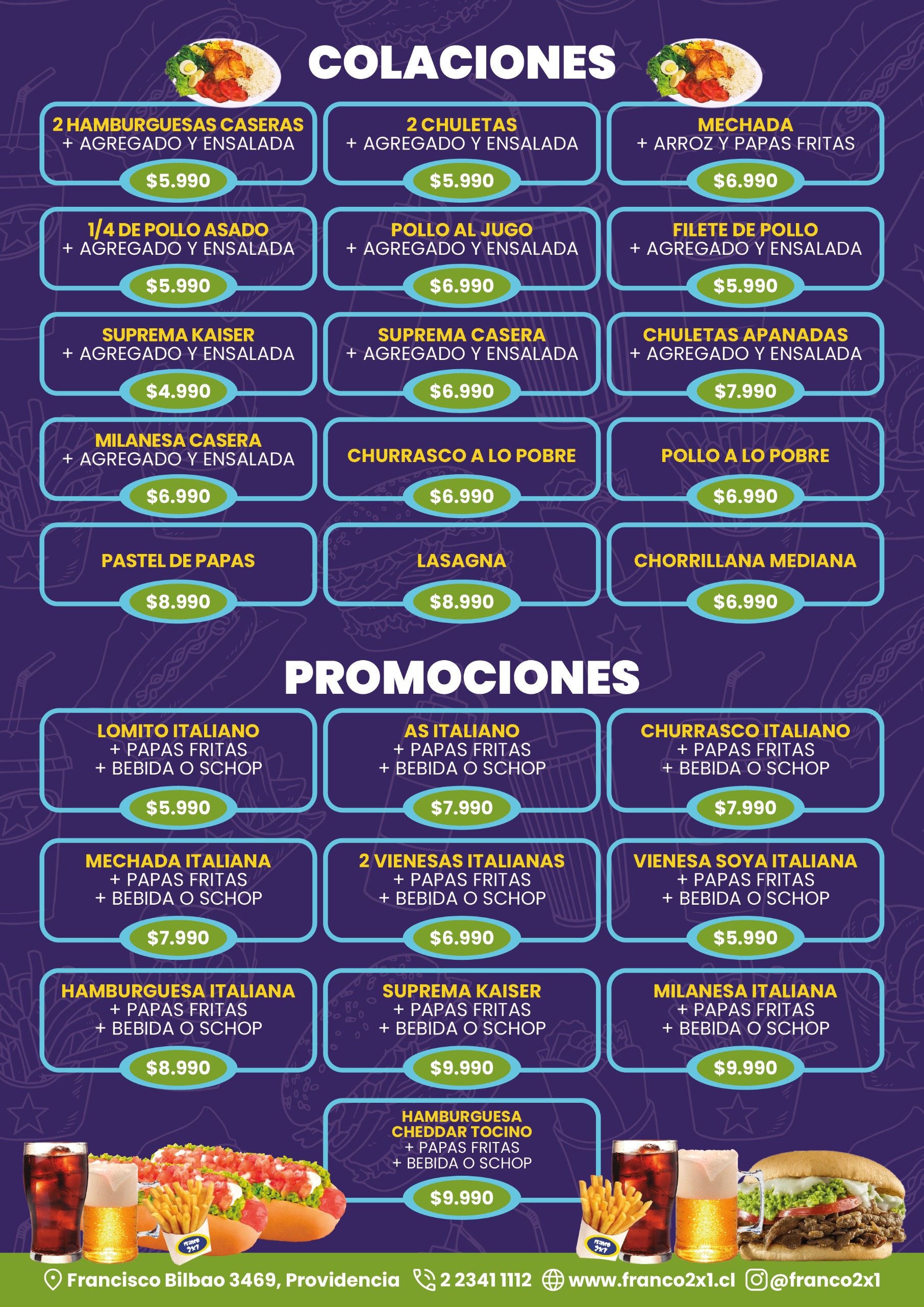 Bienvenidos a Franco 2x1, el mejor restaurante de comida italiana, hamburguesas y promociones 2x1 en Chile. Especialistas en para servir y llevar. Ofrecemos deliciosas colaciones, sándwiches, empanadas, aperitivos, bebidas, hamburguesas gourmet, pastas italianas, pizzas caseras y combos familiares. Llama ahora al +56 2 2341 1112 o +56 9 8527 9592 para hacer tu pedido. ¡La mejor comida casera de Chile te espera!